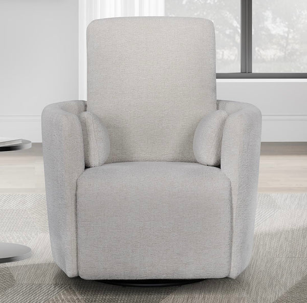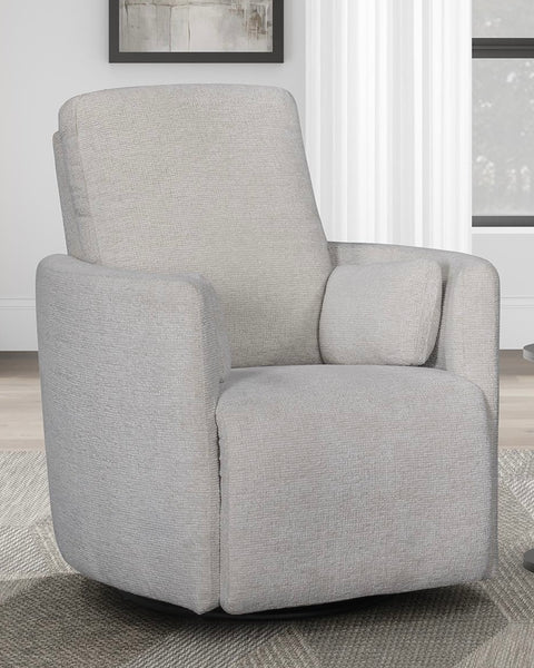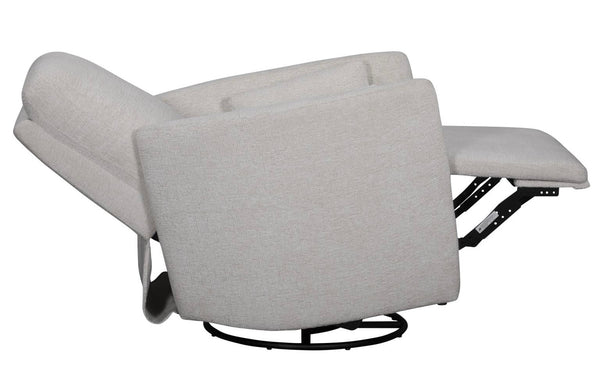 The Turner glider recliner is a sanctuary of comfort wrapped in elegance. Its smooth manual reclining mechanism, 360-degree swivel, and gentle gliding motion create a soothing experience, while rounded arms and two matching removable side pillows add softness and style. Available in Cloudscape, a soft, neutral, stain-resistant fabric.